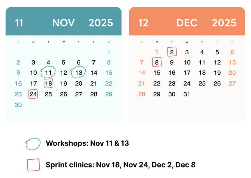What if I get stuck after the workshop ends? That's what the sprint clinics are for. You'll have 4 chances to get unstuck before the year ends.