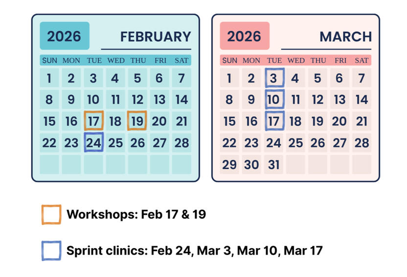 What if I get stuck after the workshop ends? That's what the sprint clinics are for. You'll have 4 chances to get unstuck before Apr 30.